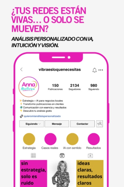 Soy Ana Abelleira y creo que las redes no son un escaparate de likes, sino una oportunidad para conectar de verdad. Te ayudo a que tu marca deje huella con estrategia, emoción e innovación a través de mis servicios como consultora de redes sociales.